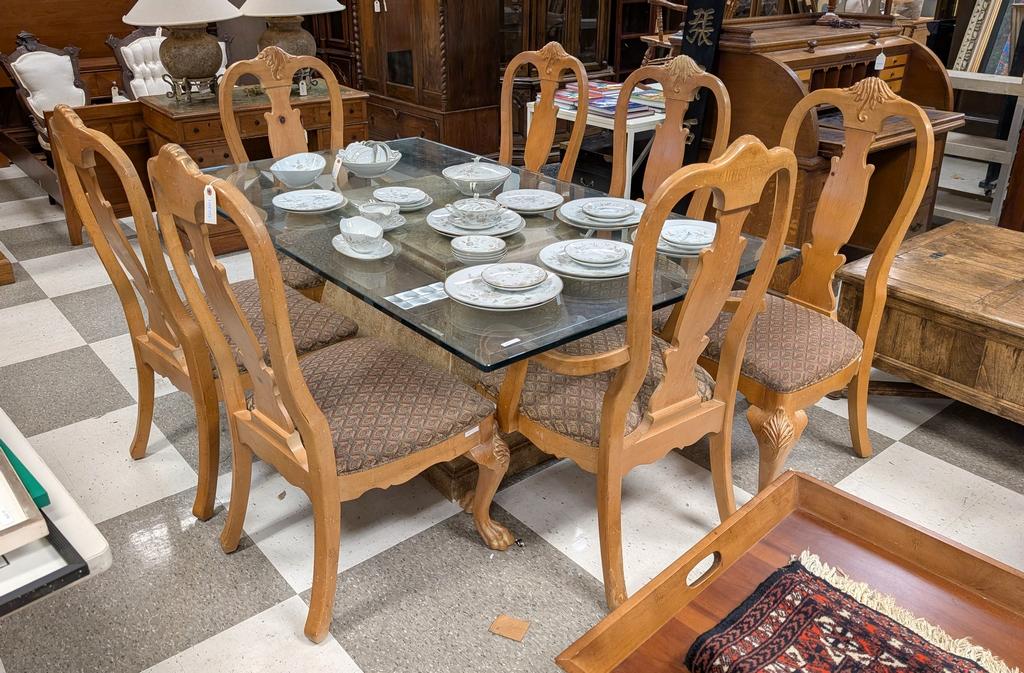 Lot 773: Glass Top Pedestal Table And 8 Pine Dining Chairs.
