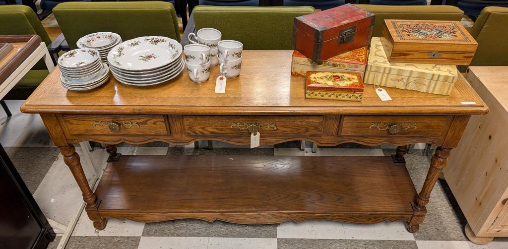 Lot 779: Oak 3-Drawer Sofa Table. Hickory Furniture Co. 60" X 17" X 28".