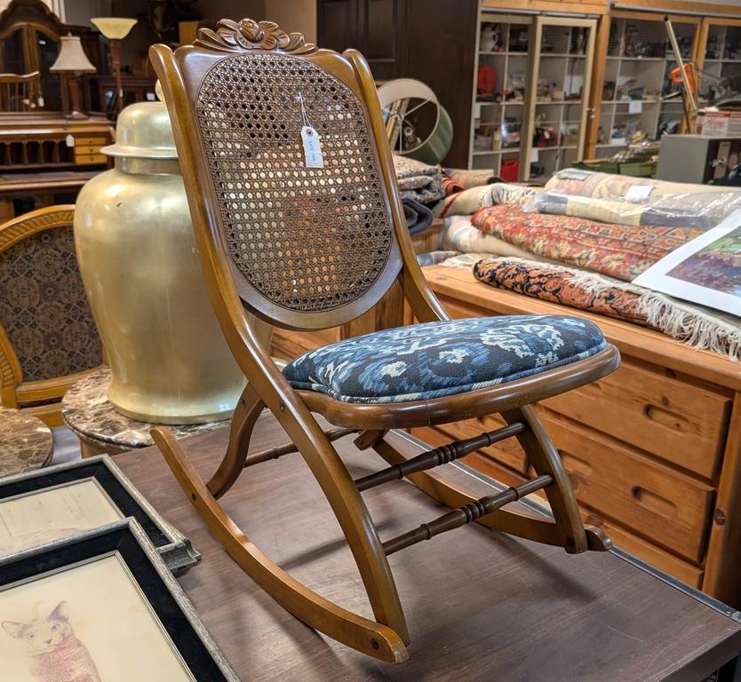 Lot 789: Cane Back Rocker With Blue And White Upholstered Seat.
