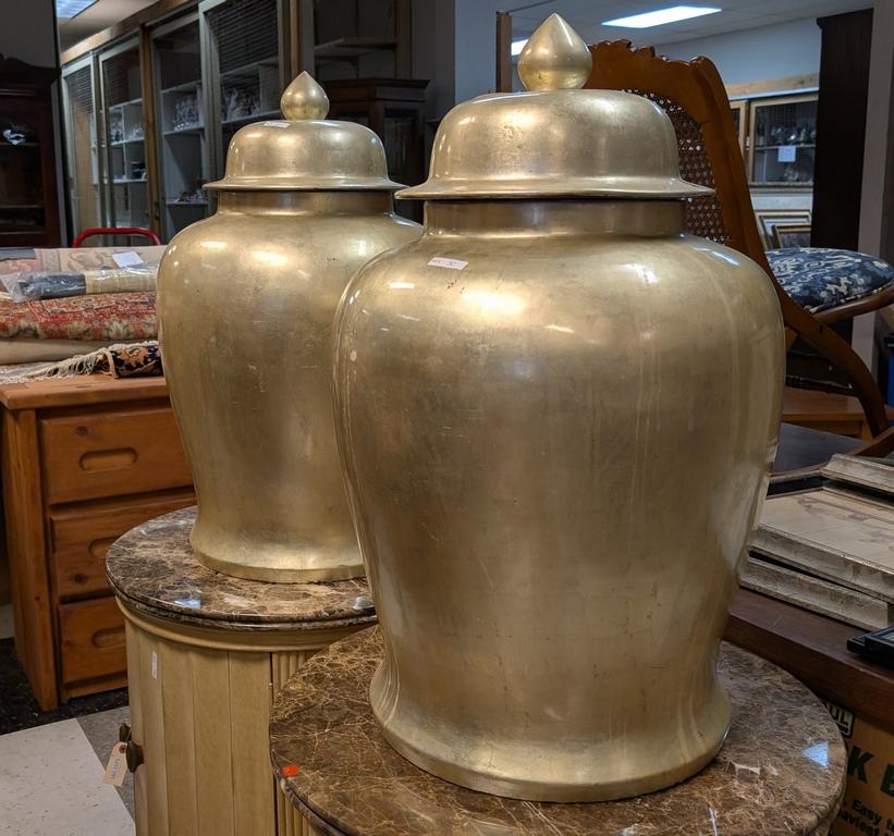 Lot 790: Pair Of Large Porcelain Gilt Painted Lidded Urns. 32" X 18"