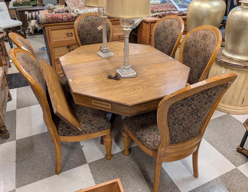 Lot 793: Oak Octagonal Dining Table With 2 Leaves And 6 Chairs.