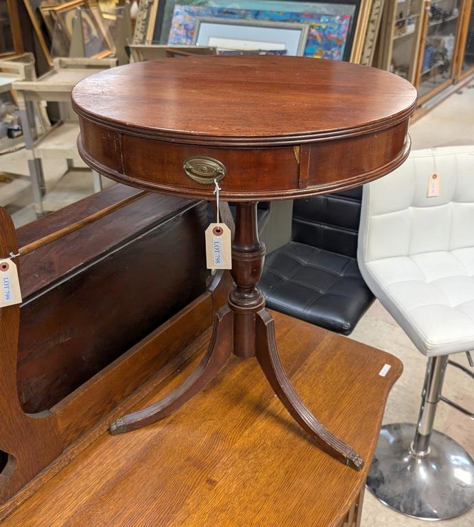 Lot 798: Mahogany Single Drawer Drum Table On Pedestal Base And Splayed Legs.