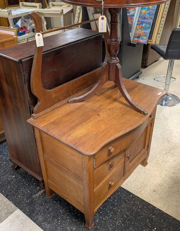 Lot 799: Early 20th C. Oak Single Door, 3-Drawer Washstand With Towel Rack.