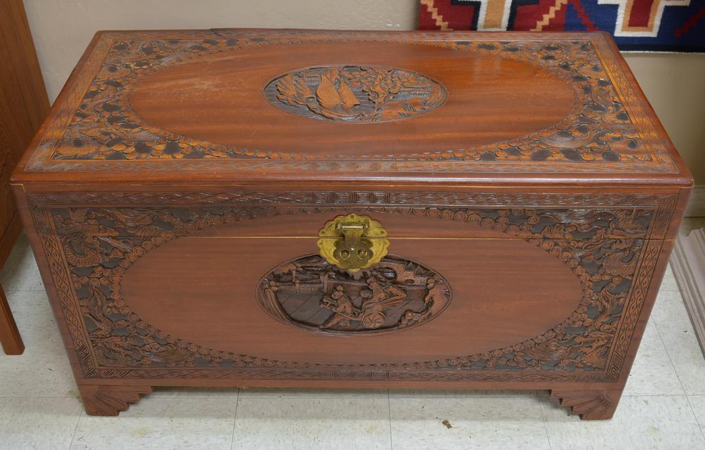 Lot 133: Oriental Carved Wood Camphor Chest.