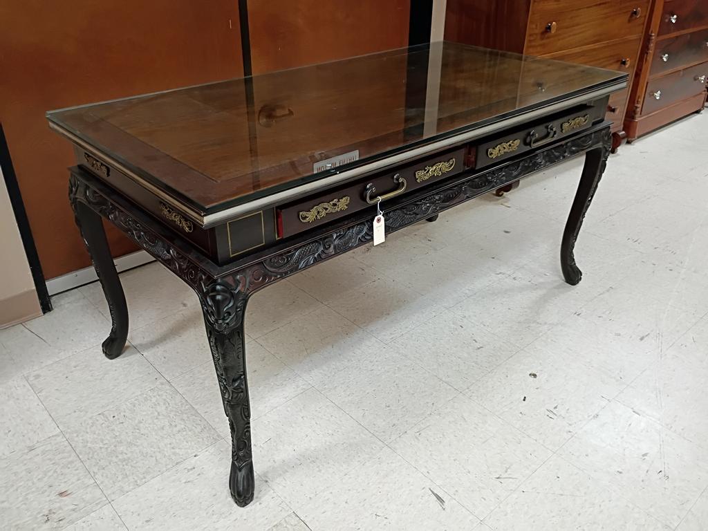 Lot 139: Chinese Carved Rosewood 2-Drawer Desk. Rectangular Top With Exquisitely Carved Apron. 60" X 30" X 30".