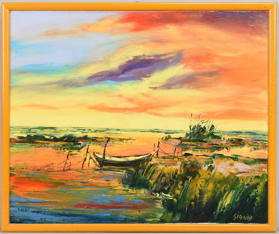 Lot 144: Robert Signes Oil On Canvas, "Coucher De Soleil, En Camargue". Signed