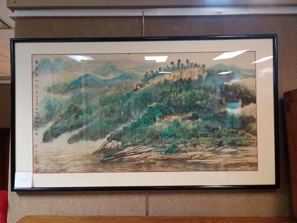 Lot 452: Chinese Watercolor, Hillside Landscape With Houses And Boat.