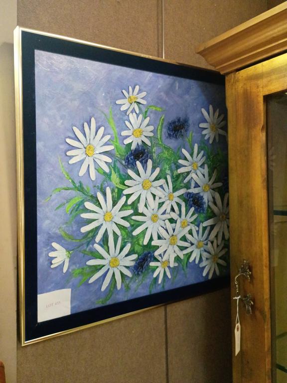 Lot 455: G. Duncan Mixed Media On Purple Background, Sunflowers. Signed.