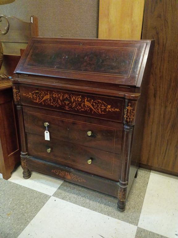 Lot 465: Marquetry Inlay Mahogany Drop Front Writing Desk.