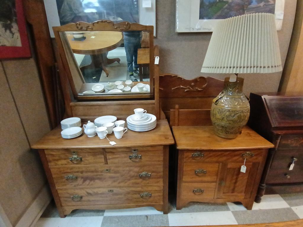 Lot 468: Cherry Wood 4-Drawer Chest With Mirror, Washstand And Full Bed.