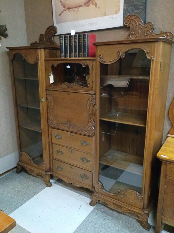 Lot 480: Oak Secretary Cabinet With 2 Glass Front Bookshelves And 3 Drawers.
