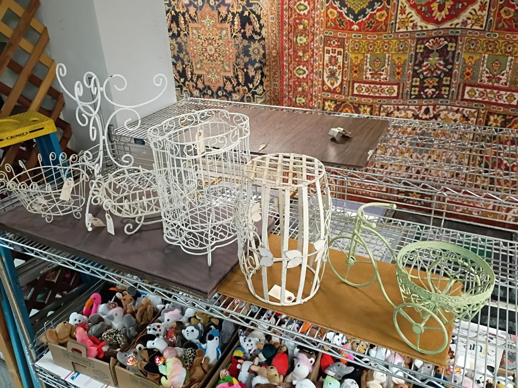 Lot 487: (4) White Painted Metal Plant Stand And A Green "Bike" Plant Stand.