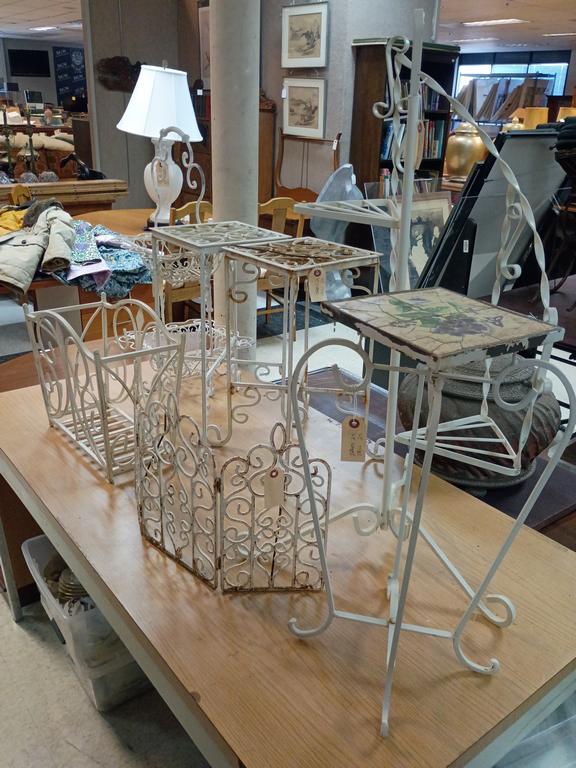 Lot 490: (6) White Metal Plant Stands And A Small Screen.