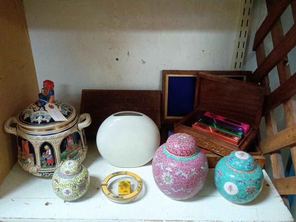 Lot 494: Shelf Of Knick Knacks Incl. Asian Ginger Jars, Boxes.