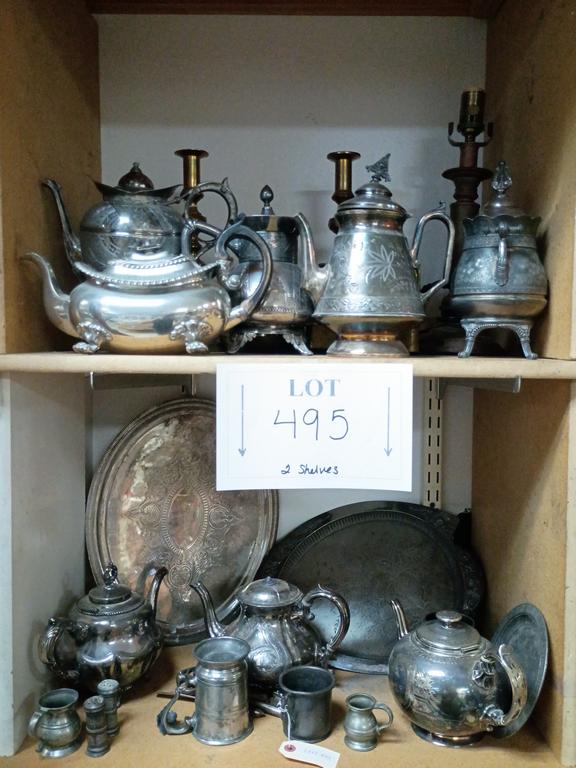 Lot 495: (2) Shelves Of Silver Plated Items Incl. Coffee Pots, Platters.