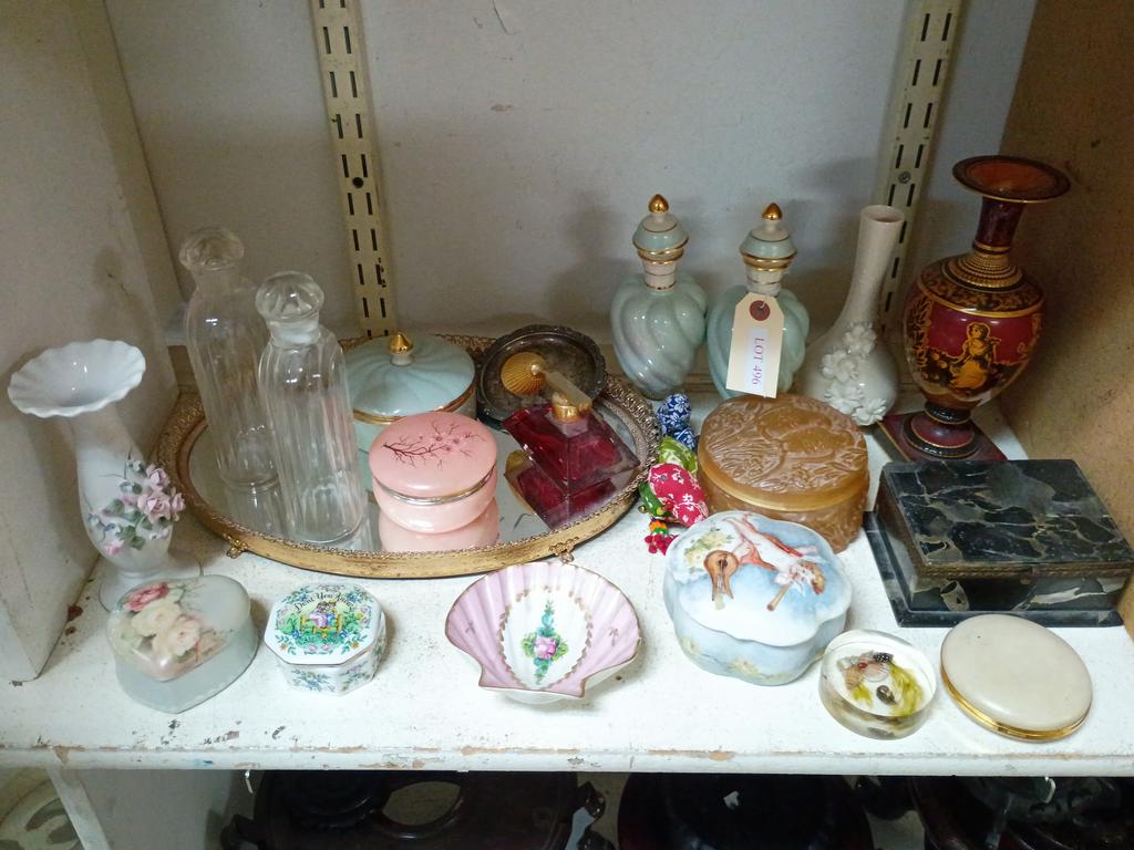 Lot 496: Shelf Of Decorative Items Incl Dresser Boxes