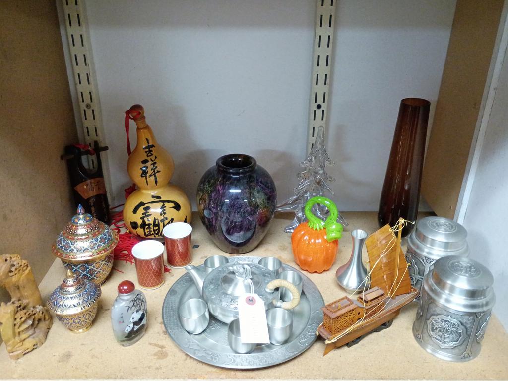 Lot 499: Shelf Of Knick Knacks Incl. Tumasek Pewter Dishes, Vases.
