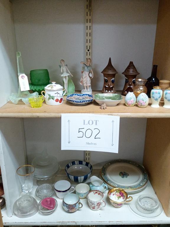 Lot 502: (2) Shelves Of Knick Knacks Incl. Figurines, Salt & Pepper Shakers.