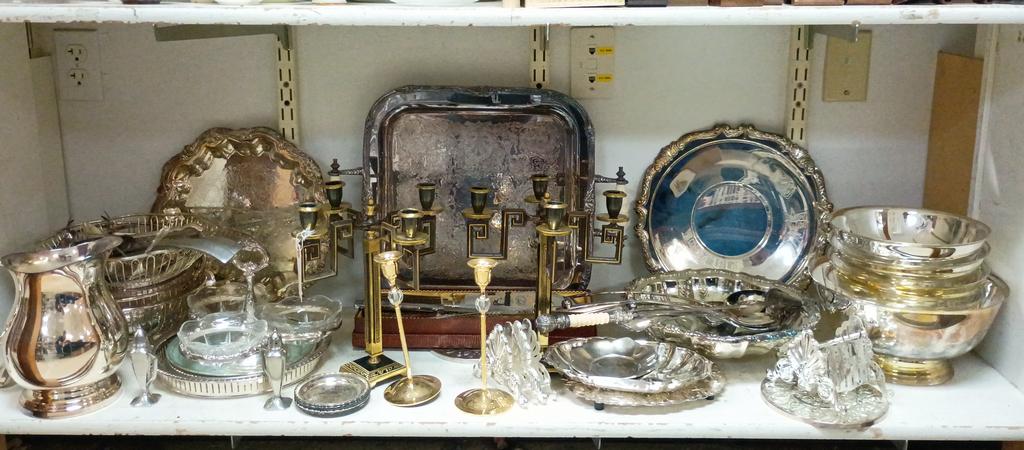 Lot 503: Shelf Of Silver Plated Items Incl. Bowls, Pitcher, Serving Trays.