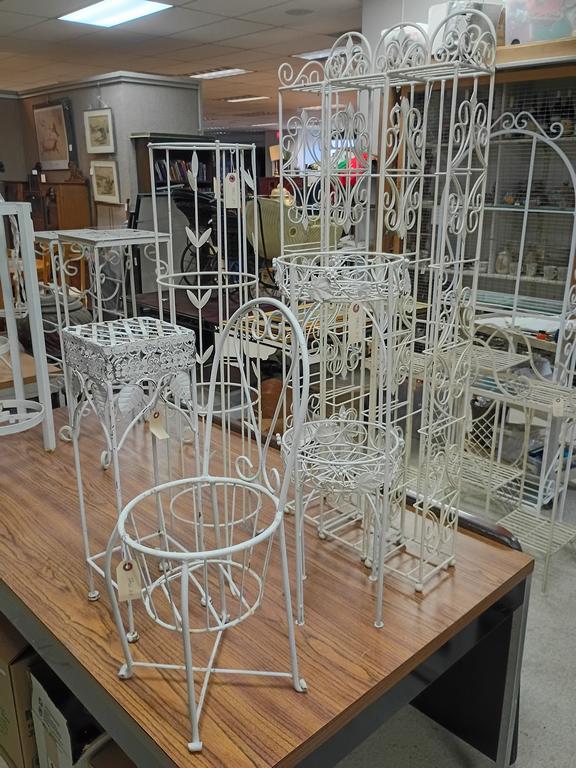 Lot 506: (5) White Painted Metal Plant Stands Incl. Chair Form.