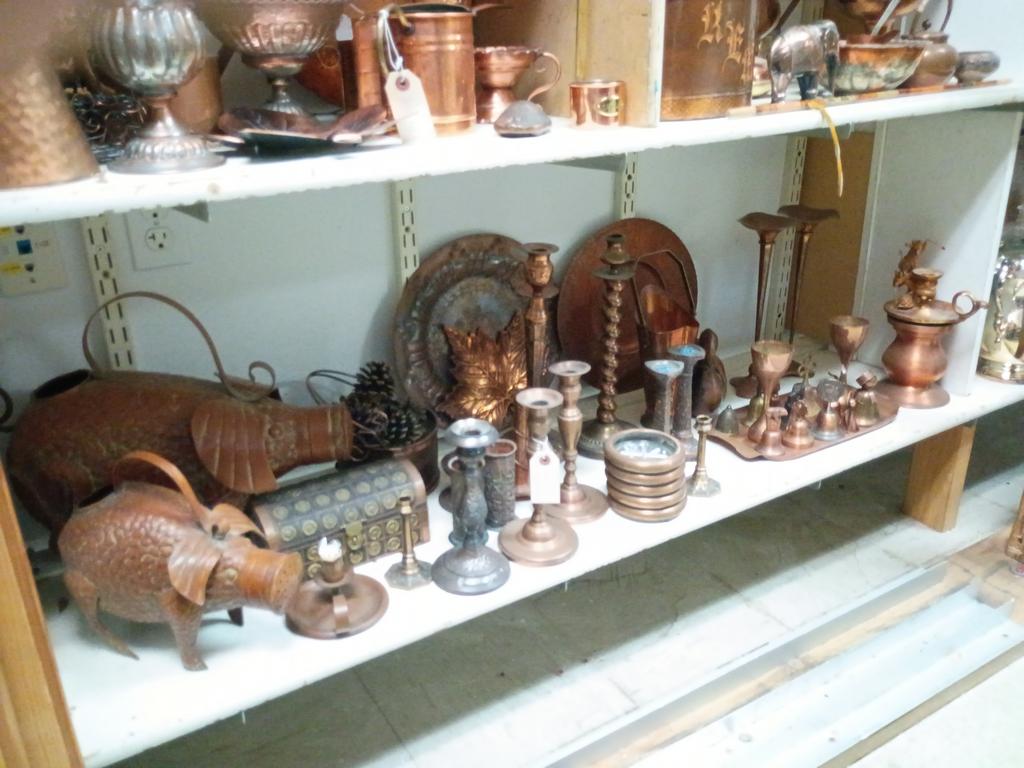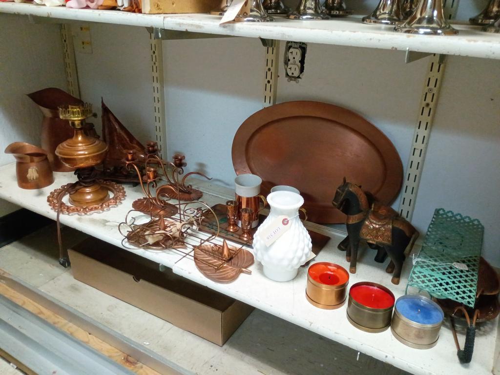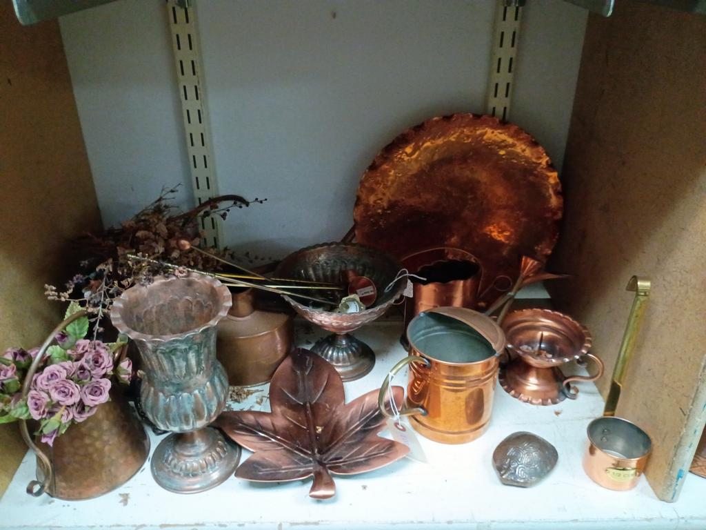 Lot 518: Shelf Of Copperware And Decorative Items.