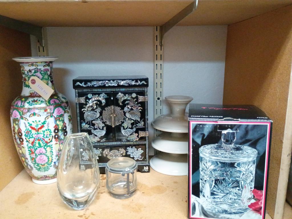 Lot 515: Shelf Of Knick Knacks Incl. Asian Style Jewelry Box.