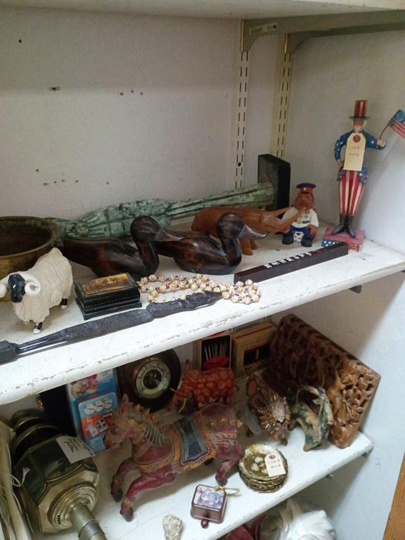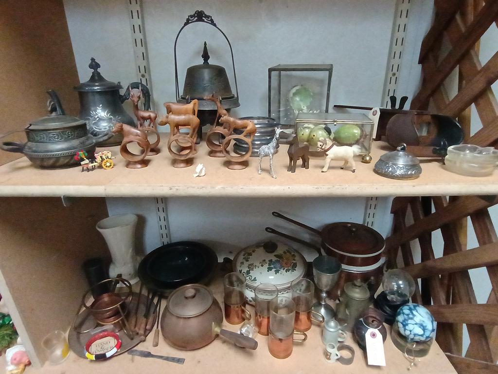 Lot 522: (2) Shelves Of Decorative Items Incl. Animal Figures, Copperware.