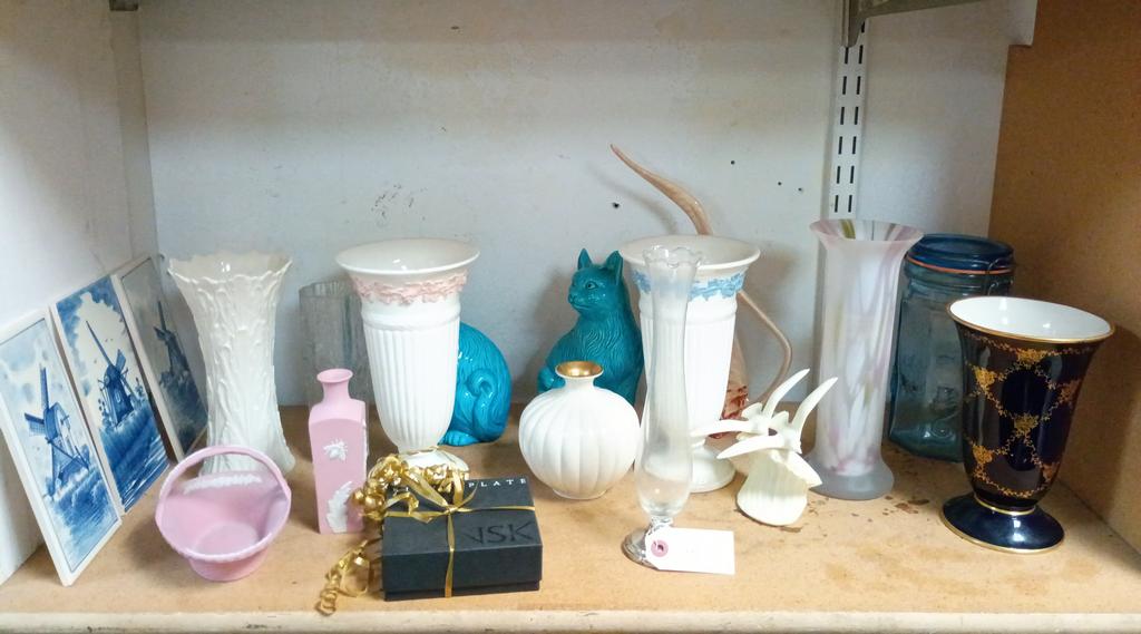 Lot 523: Shelf Of Decorative Items Incl. Wedgwood Vases, Cat Figures.