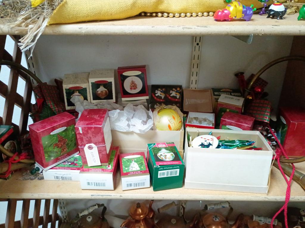 Lot 529: Shelf Of Christmas Ornaments.