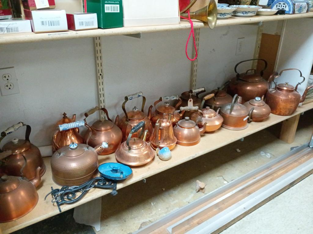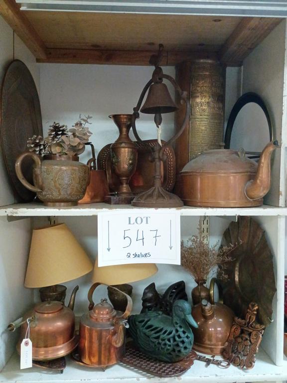 Lot 547: (2) Shelves Of Copperware Incl. Kettles, Table Lamps.