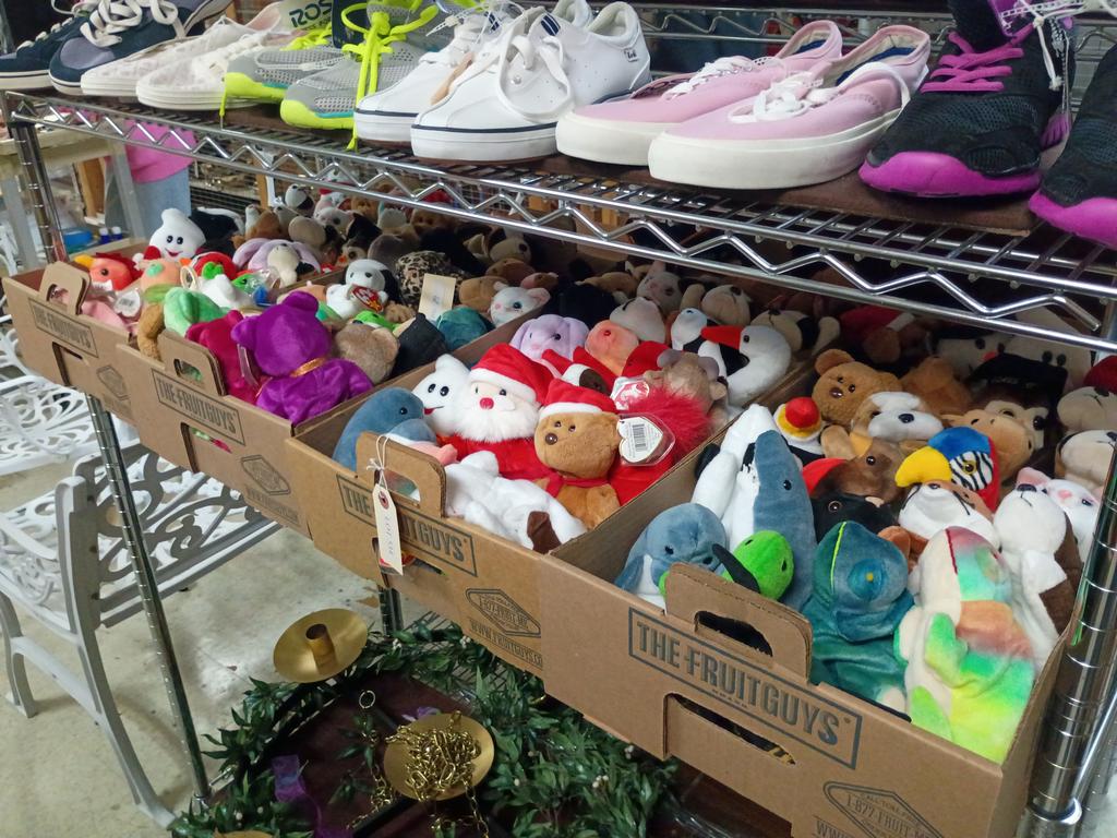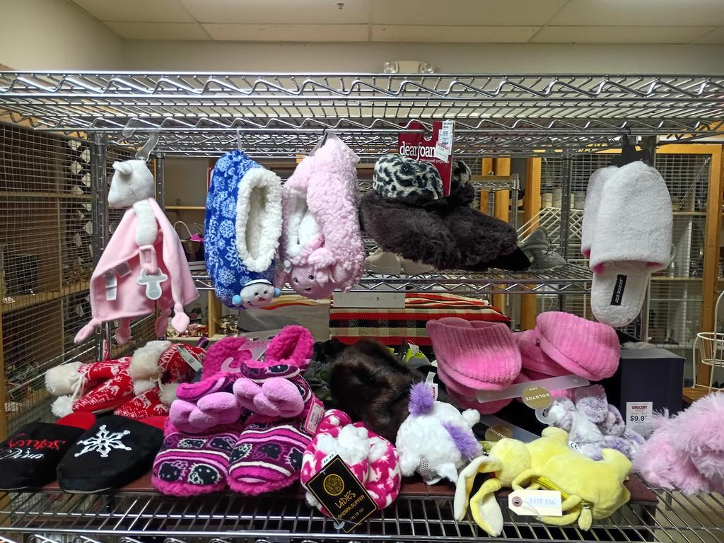 Lot 536: Shelf Of Comfy House Slippers And Soft Baby Toys.