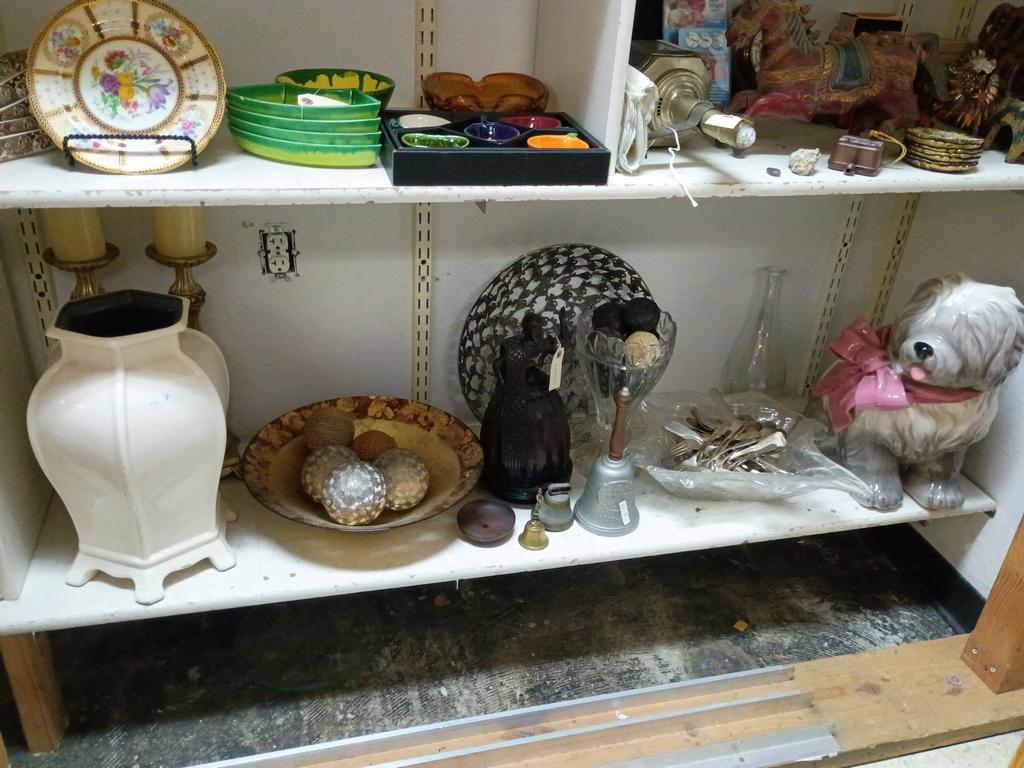 Lot 543: Large Shelf Of Decorative Items Incl. Ceramic Dog, Vases, Flatware.