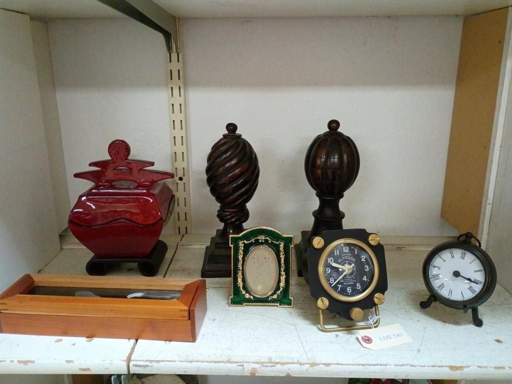 Lot 545: Shelf Of Decorative Items Incl. Desk Clocks, Lidded Ceramic Vessel.