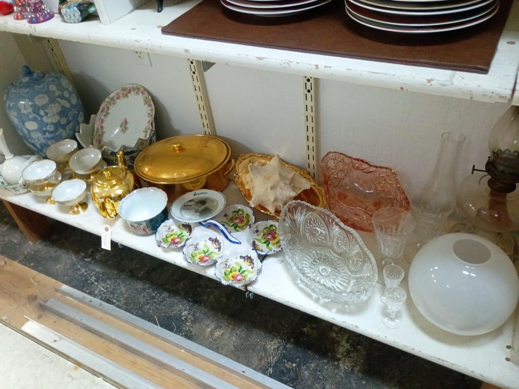 Lot 549: Shelf Of Household Items Incl. Goldware Oil Lamp, Serving Dishes.