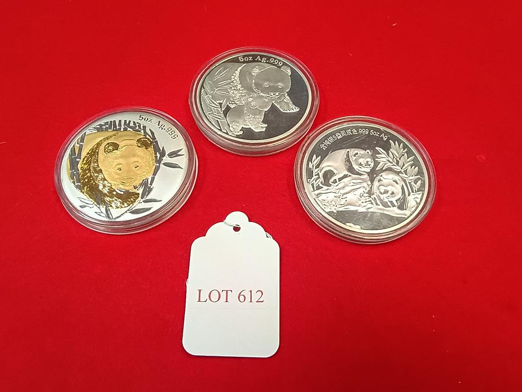 Lot 612: (3) 1991 Chinese Fine Silver Panda 5 Oz. Coins.