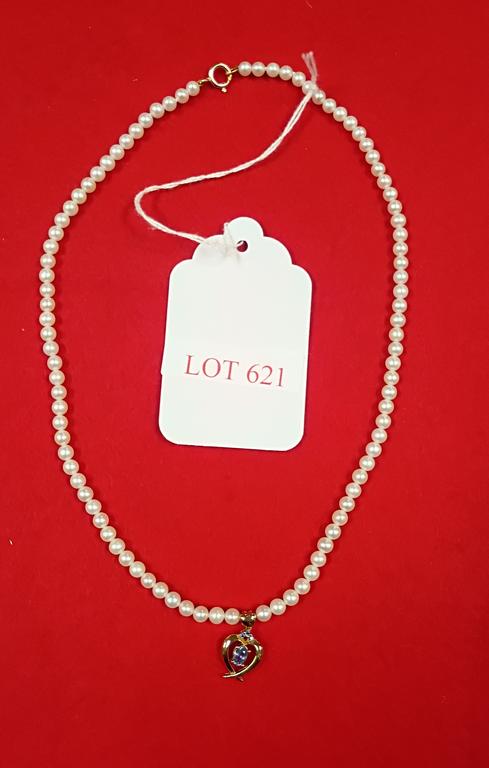 Lot 621: Pearl Necklace With 14k Heart Pendant With Blue Stone