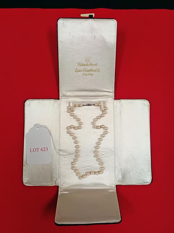 Lot 623: Mikimoto Pearl Necklace With 'M' Logo. 18" Long.