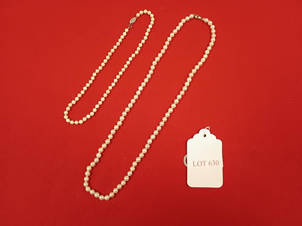 Lot 630: (2) Pearl Necklaces With 14k Yellow And White Gold Clasps.