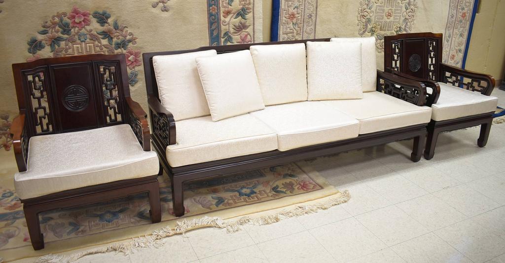 Lot 209: Oriental Rosewood Plank Seat Sofa And 2 Armchairs