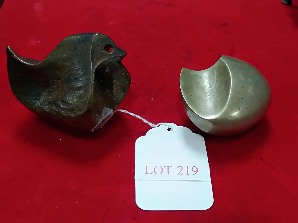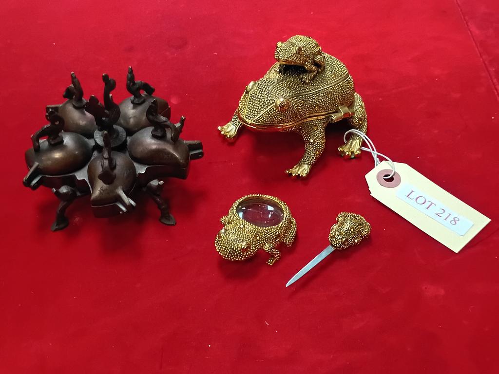 Lot 218: Indian Peacock Kumkum Spice Box And Gilt Toad 3-Pc Desk Set.