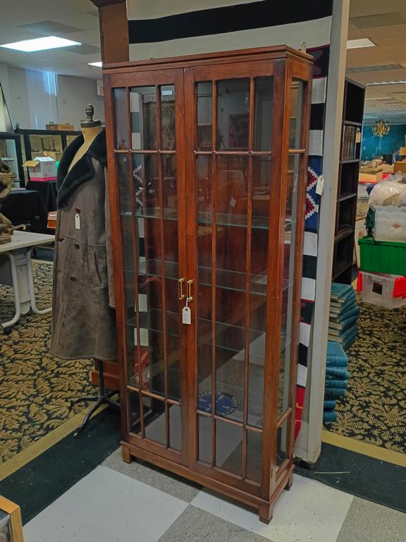 Lot 221: Mission Style Oak Glass Front Display Cabinet With 5 Glass Shelves.