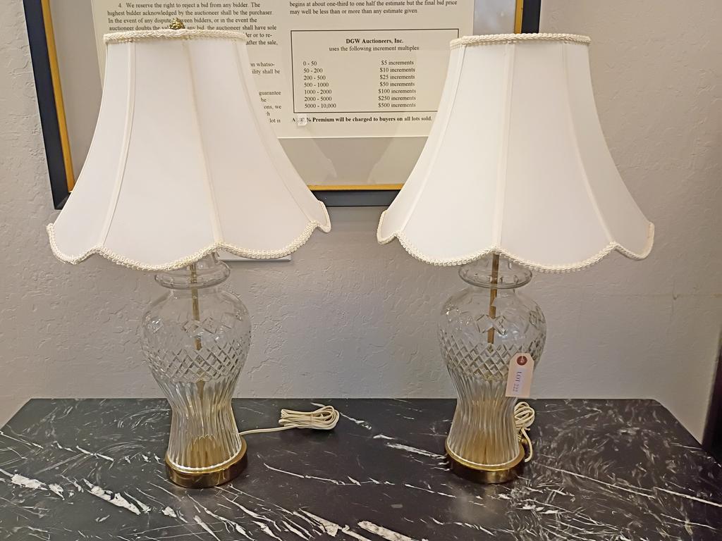 Lot 222: Pair Of Clear Crystal Table Lamps With White Silk Shades.