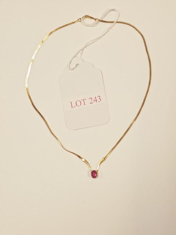Lot 243: 14K Yellow Gold Necklace With Pink Stone.