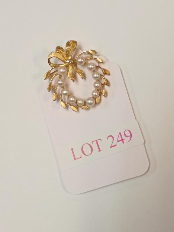 Lot 249: 14K Yellow Gold Wreath Form Pin With Pearls.