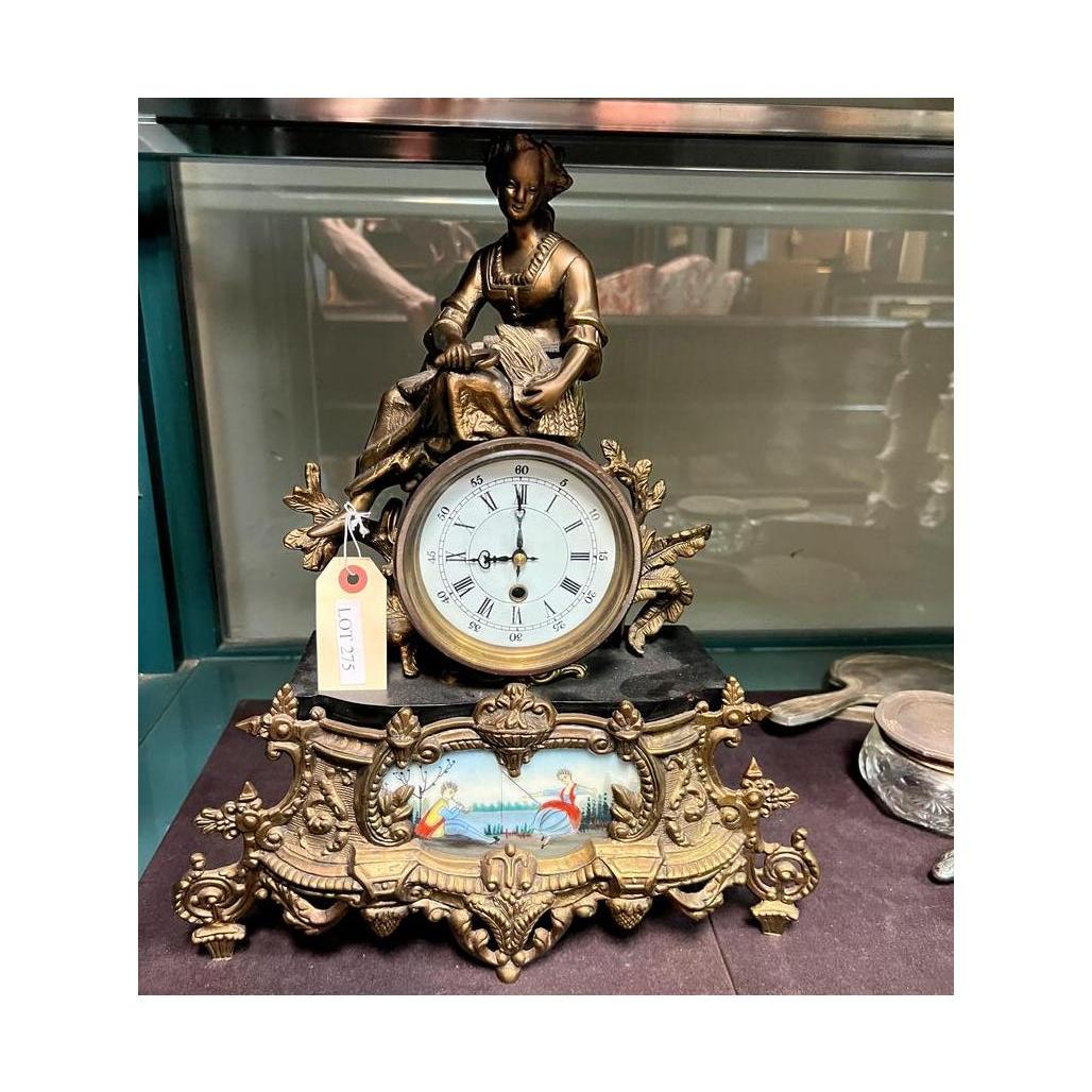 Lot 275: Continental Gilt Metal Mantel Clock. Seated Lady Finial, Hand Painted Panel At The Bottom. 16.5" Tall.