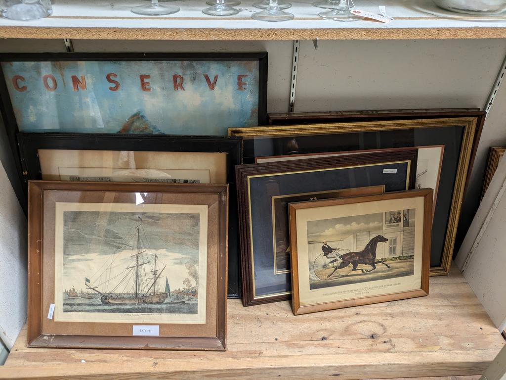 Lot 711: (7) Framed Wall Hangings Incl. Ships, Equestrian Prints. (Alt BP).