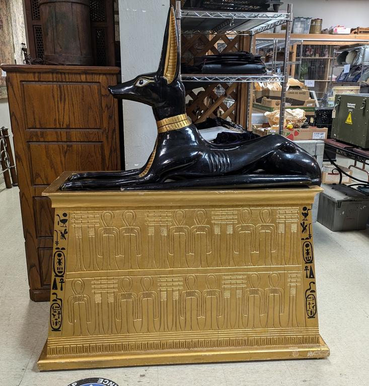 Lot 723: Composition Anubis Sculpture On Sarcophagus. Black And Gilt Painted With Wooden Tail (Unattached). Over A Gilt Painted Sarcophagus. Overall: 54" X 23" X 62.5". (Alt BP).