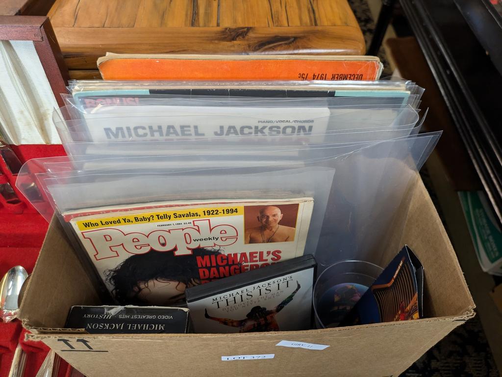 Lot 372: Group Of Michael Jackson Collectibles Incl. Videos, Magazines, Cirque Du Soleil Cup.