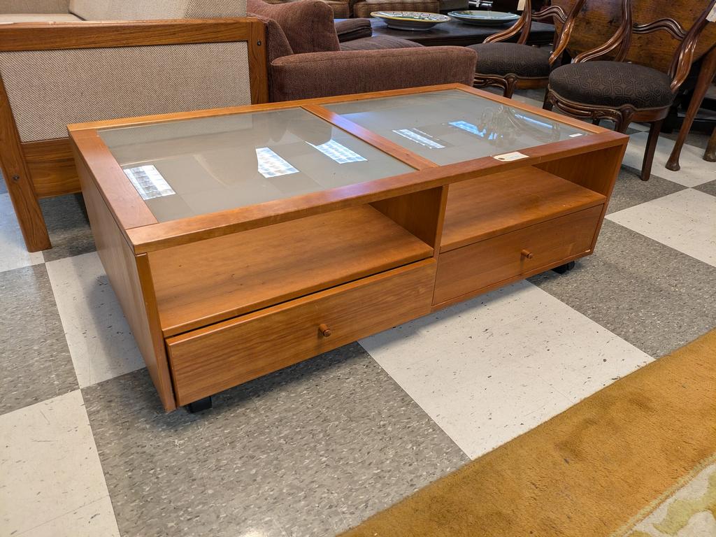 Lot 834: Contemporary Frosted Glass Top Coffee Table With Pass Through Drawers.