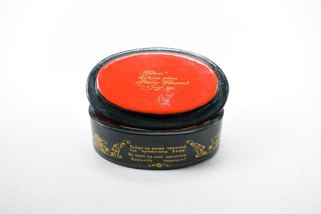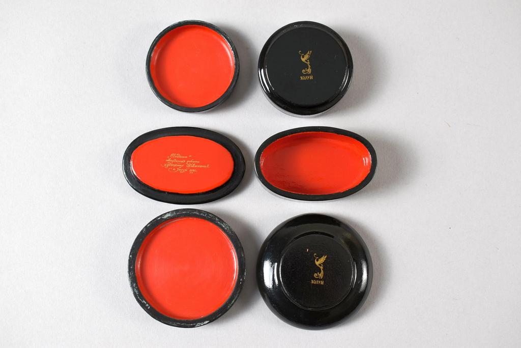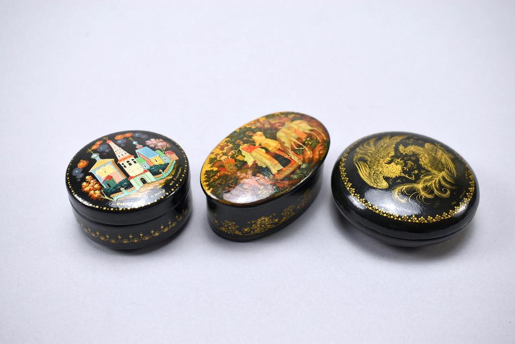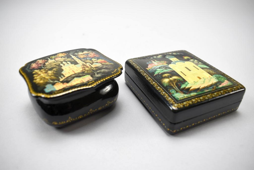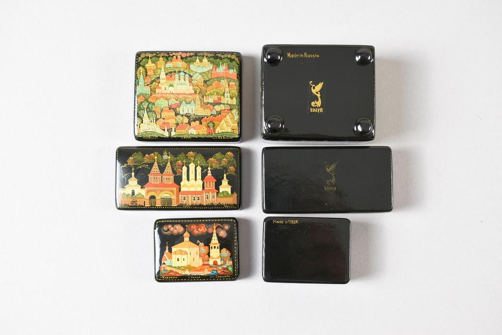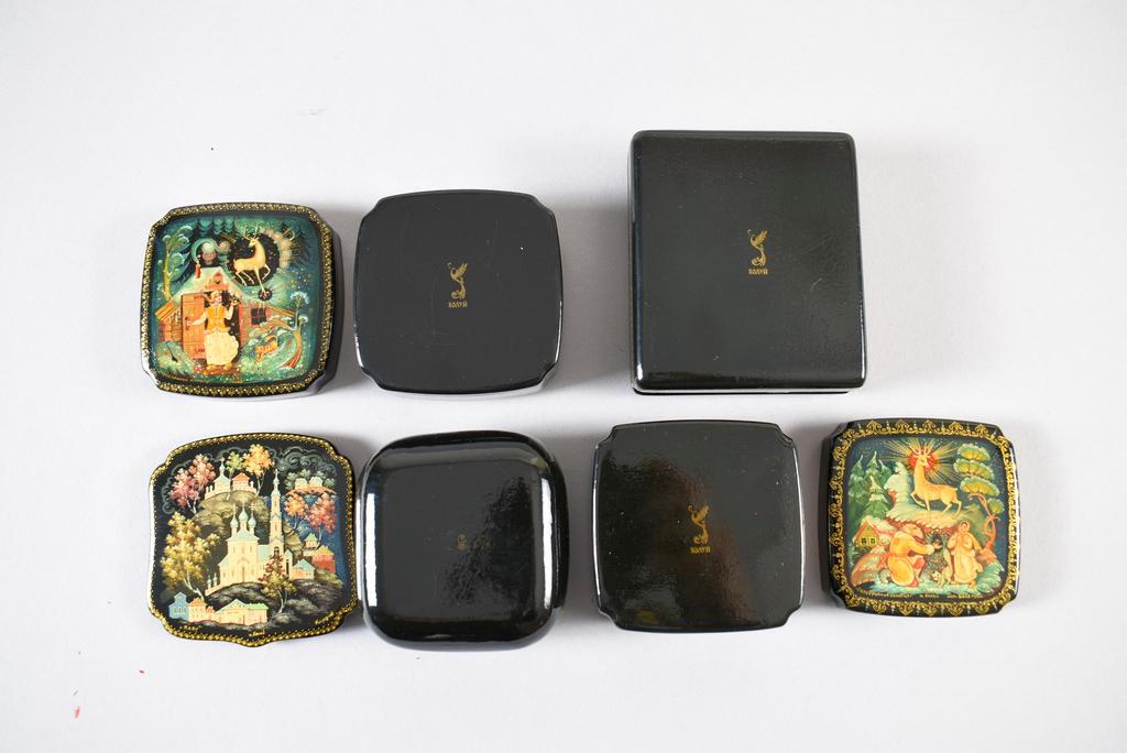 (10) Kholui Russian lacquer boxes depicting various fairy tales. Largest: 3 1/2" x 3.